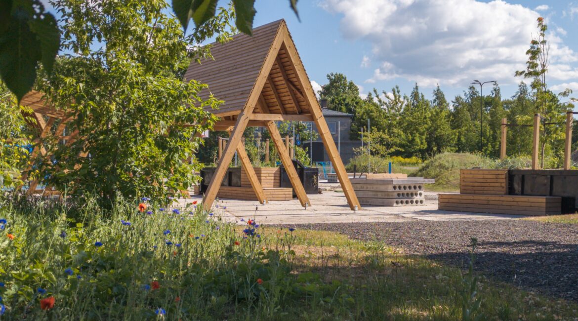 The purpose of the interim park is to provide temporary public space, addressing the needs of the Uus-Veerenni community during ongoing developments. The park’s concept is based on maximizing the use of existing spatial features. The former warehouse’s concrete surface was transformed into an active area with ball courts and shelters. Landscape elements such as bridges, stands, and bike track features were created from leftover materials. The preserved natural vegetation is self-seeded and wild, while landscaping planted in repurposed containers is movable and can be reused at a new location, along with all newly added elements.